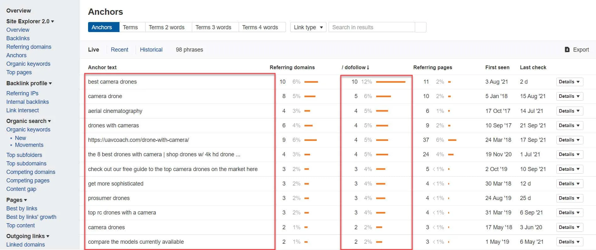 To do this, go to Ahrefs and check the top-ranking pages for your money keywords. For each page, click on Anchors to show you data on the kind of anchor texts your competitors used and how many of the links are dofollow.