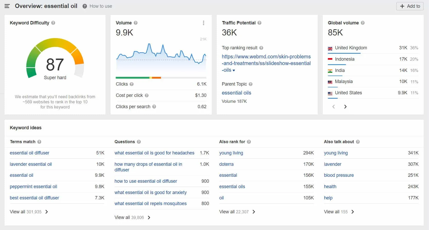 Another way to search for niche ideas is by using Ahrefs. It’s one of the best search engine optimization (SEO) tools in the market that helps you with different aspects of SEO.