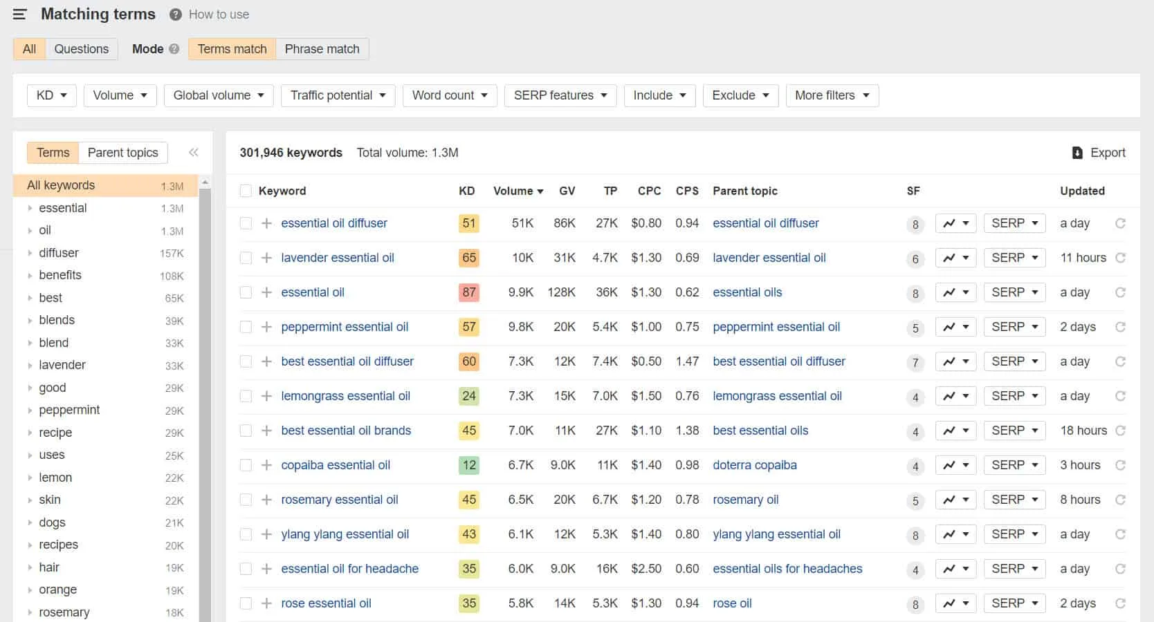 From here, view all of the Terms Match to see the most relevant keywords about the niche.
