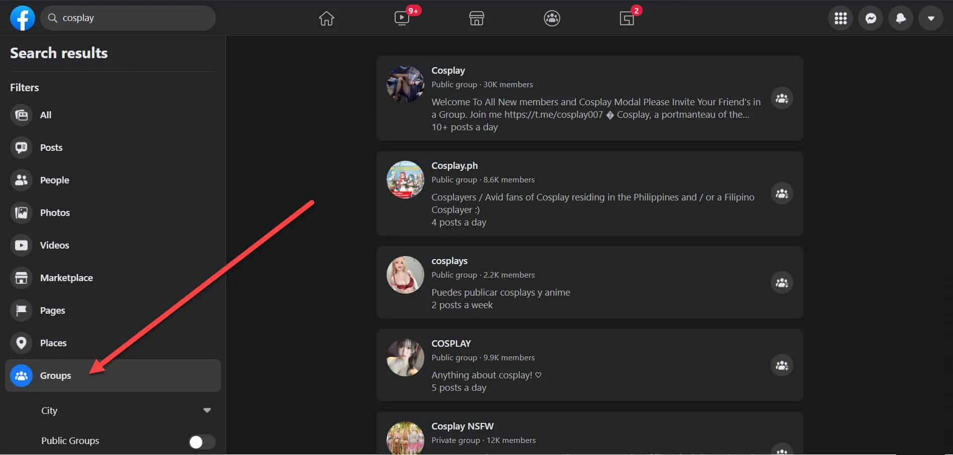 One of the easiest ways to search for these communities is through Facebook. Enter your niche topic on the search bar and filter the results to only show posts from public grounds and groups that you are a member of.