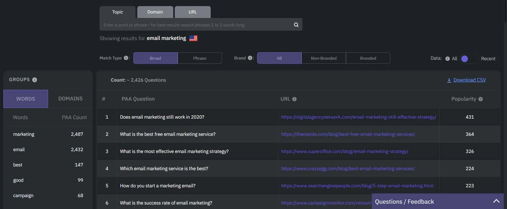 Enter your topic or niche on the search bar to get the top questions asked about it online. You can view it as data where questions are organized according to their modifiers.