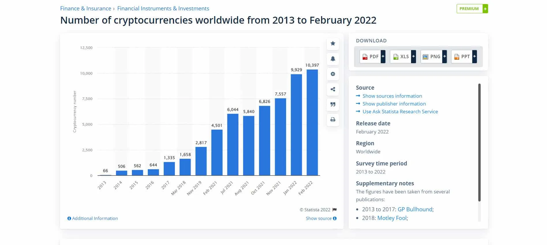 For example, Statista has a collection of statistics and data about cryptocurrency as a whole and the different currencies for trading.