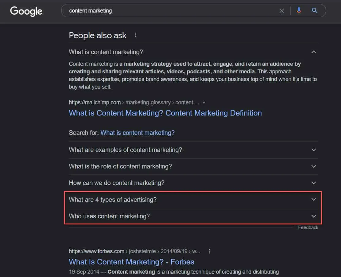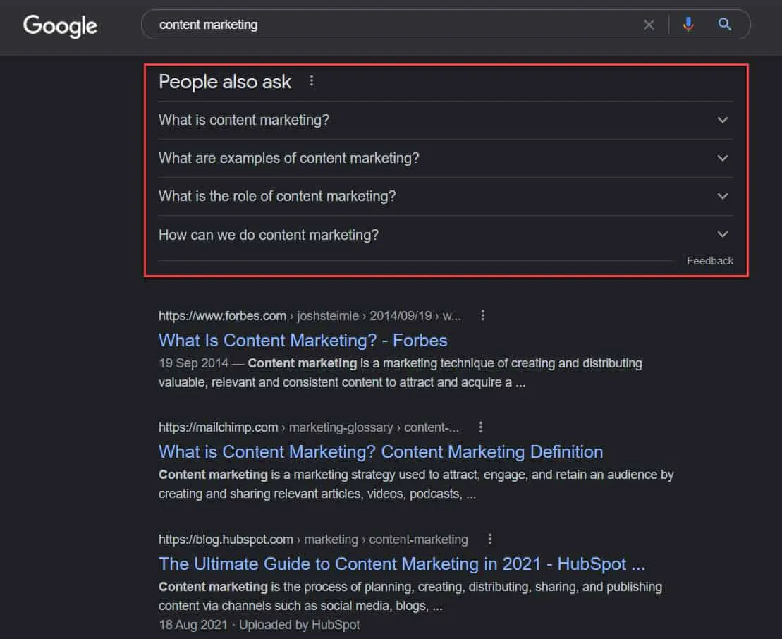 For some search queries, there’s a People Also Ask (PAA) section that shows you the most common questions about the keyword you searched for: