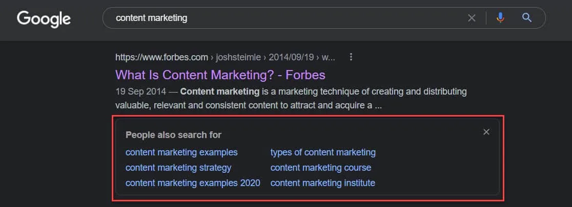 Finally, there’s a “People also search for” section that appears whenever you click on a page and click on your browser’s back button to go back to the SERPs. You should see a small box under the page you clicked on containing search queries that you can use as headers for your post.